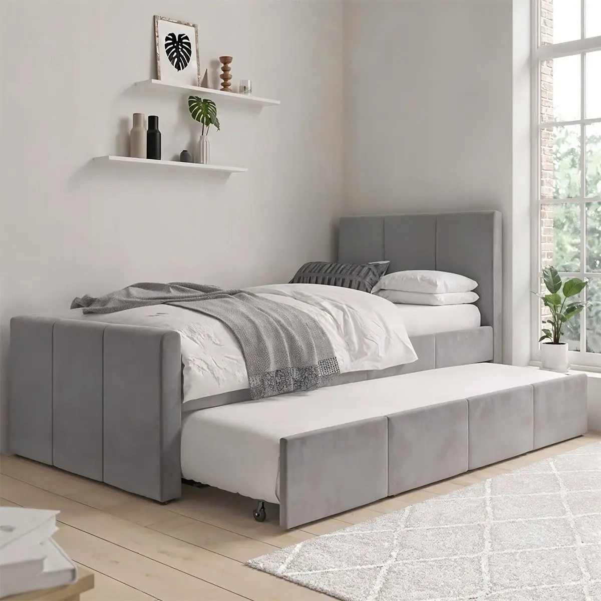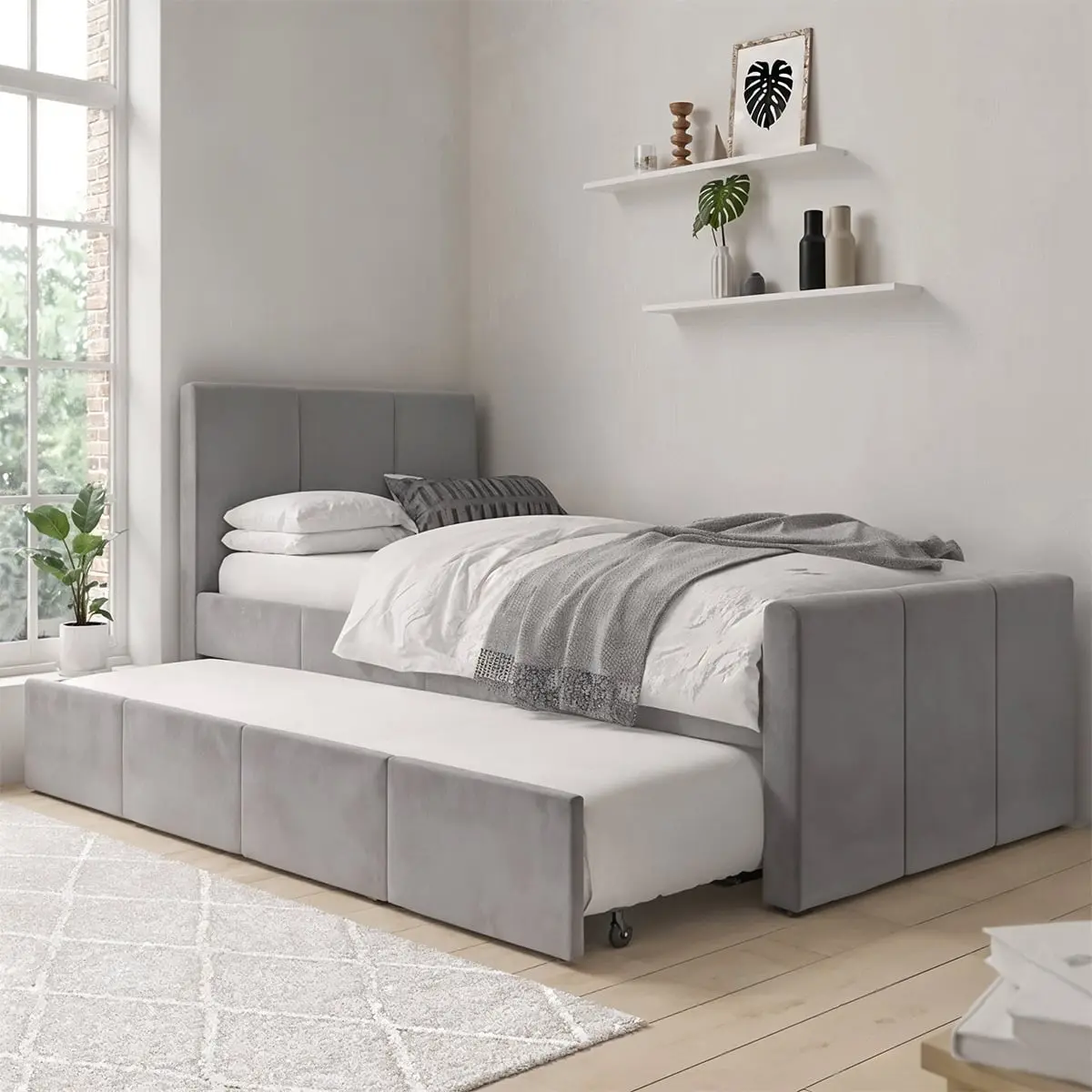 سرير بطابقين خشب موسكى و قطيفة رمادي – 105×120×200 سم