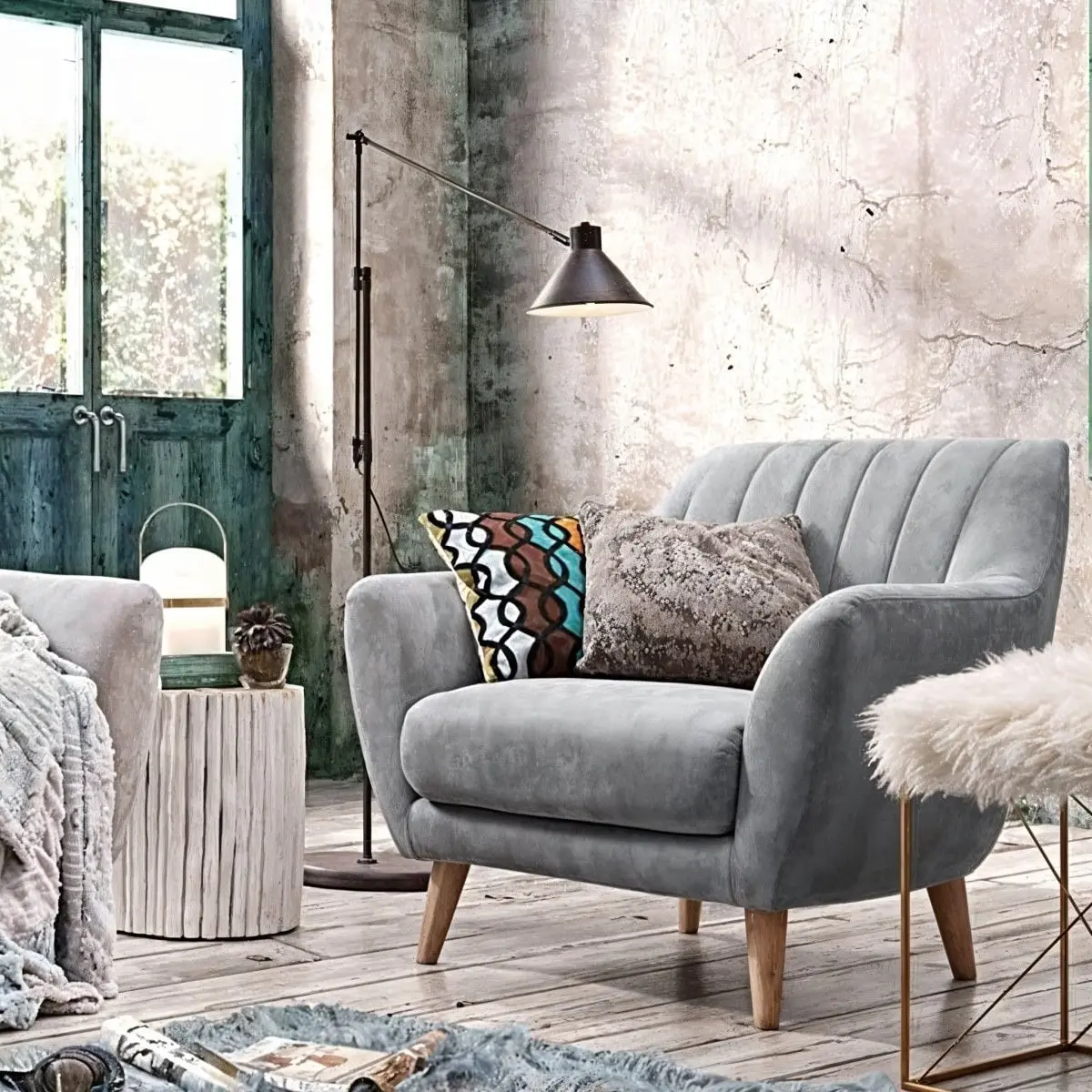 كرسي بذراعين خشب زان و قطيفة – رمادي و بيج