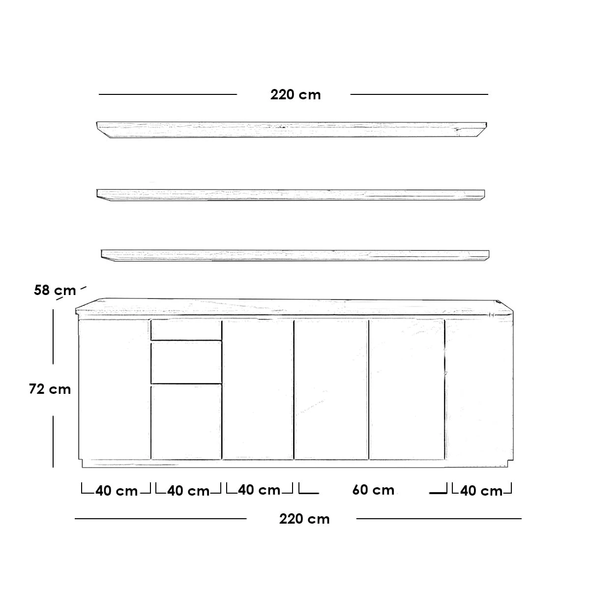 ارفف العلوية من 3 ارفف مفتوحة. 40×220 سم